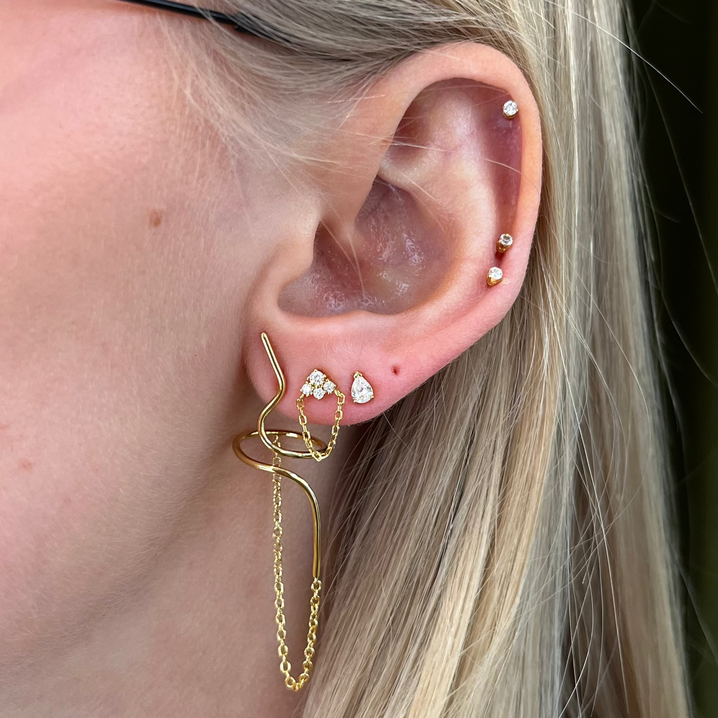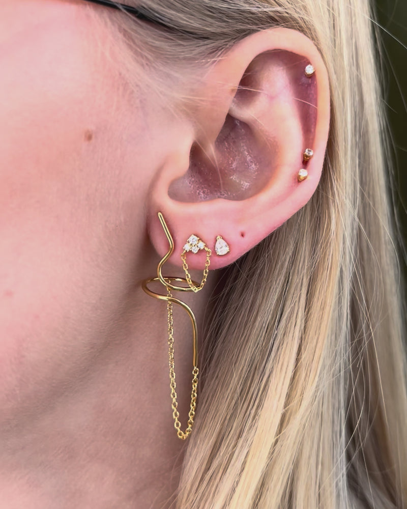Örhänget har en organisk och lätt böljande form som följer örats linje och skapar ett skulpturalt uttryck. Fina kedjor faller från designen, vilket ger pjäsen en vacker rörelse och ger en lätt och elegant look. Den guldpläterade ytan framhäver de mjuka formerna och ger örhänget en stilren och sofistikerad look.