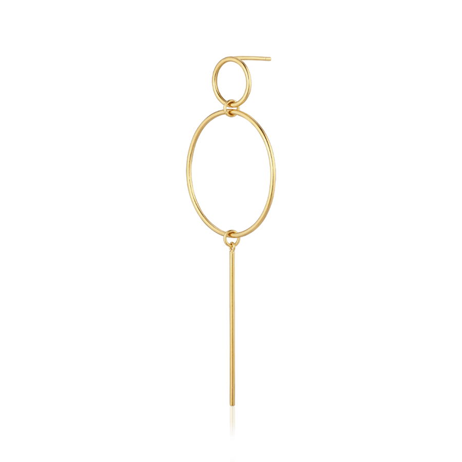 Örhänget är designat med två ljusa ringar som skapar en vacker och luftig siluett. Från den stora ringen faller ett smalt hänge, som ger örhänget en elegant längd och en fin rörelse när den bärs. Den guldpläterade ytan ger pjäsen en stilren och feminin look.