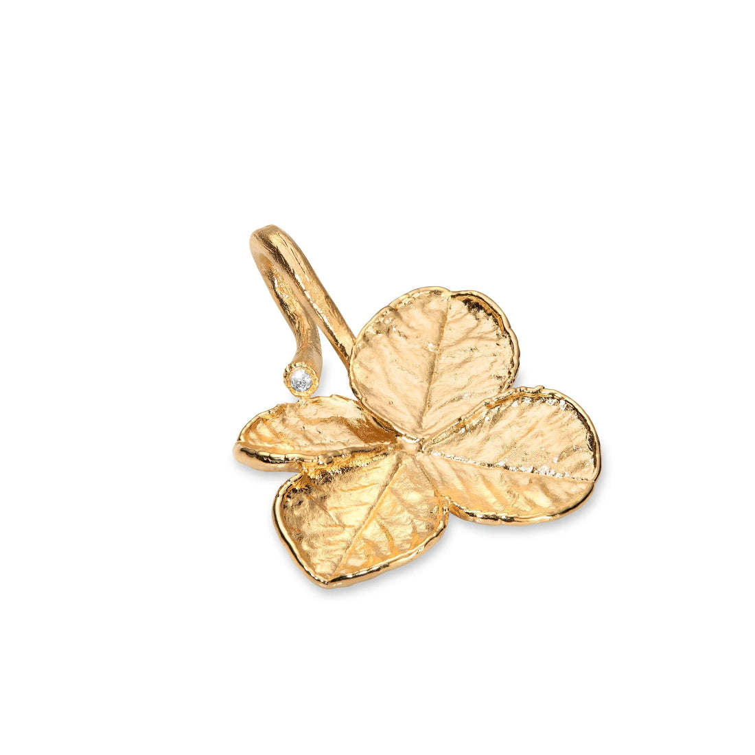 En vacker och unik fyrklöver prydd med en 0,02 ct ljus champagnefärgad diamant.