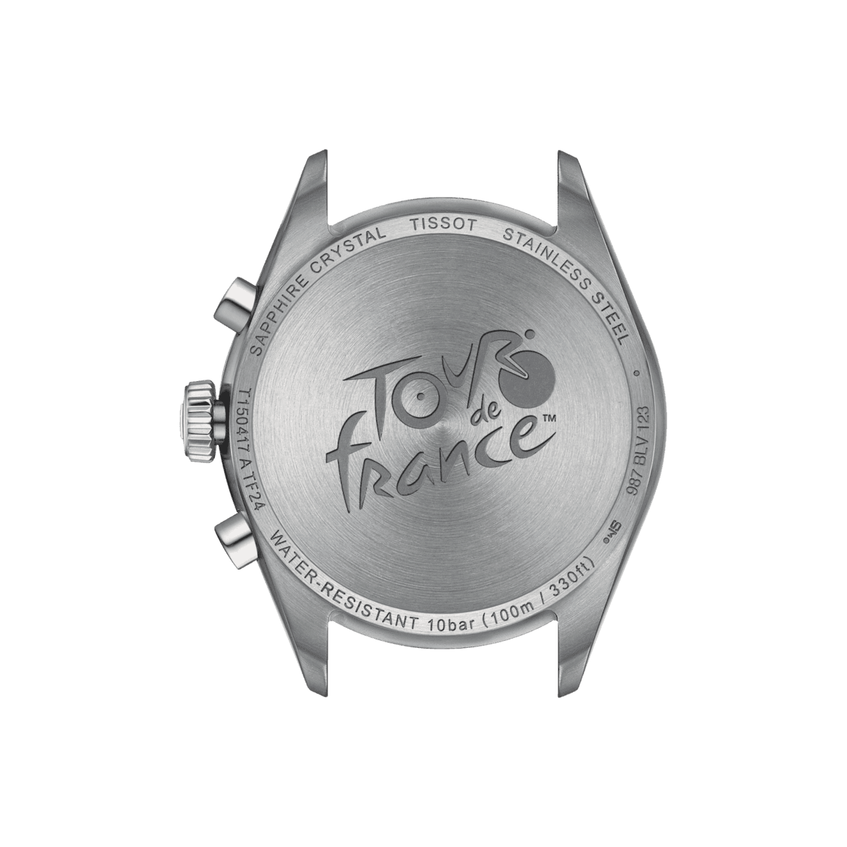 Det inbyggda G10.212 chrono quartz urverket ger precision och robusthet, kompletterat med vattentålighet upp till 10 bar (100 meter/330 fot). Synlighet i svagt ljus säkerställs av Super-LumiNova®-beläggning på de nålformade händerna. Baksidan av denna Grand Tour PR100-modell är graverad med respektive Tour de France-logotyp.