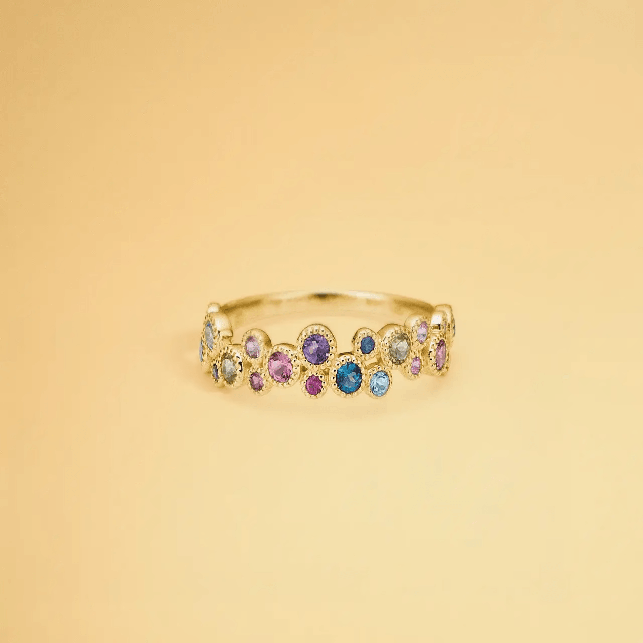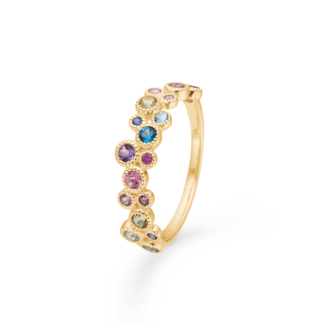 Upplev lyx och elegans med Mads Z Luxury Rainbow Petite Ringen. Denna vackra ring är dekorerad med färgglada ädelstenar som safir, rubin, topas, ametist och turkalin, som tillsammans skapar ett sofistikerat och unikt uttryck. Ringen är en exklusiv del av Mads Z Gold Label-Ssamlingen och en elegant variant av den populära bästsäljaren, lyxig regnbåge.