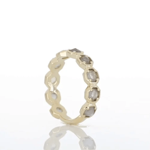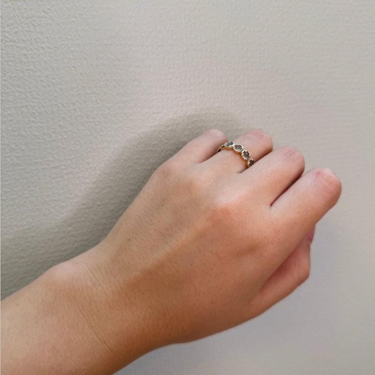 Den grå månstenen lägger till en subtil och sofistikerad glans till denna vackra ring som fångar ljuset på ett förtrollande sätt. Ett perfekt val för alla tillfällen som kommer att ge en touch av elegans till ditt utseende.