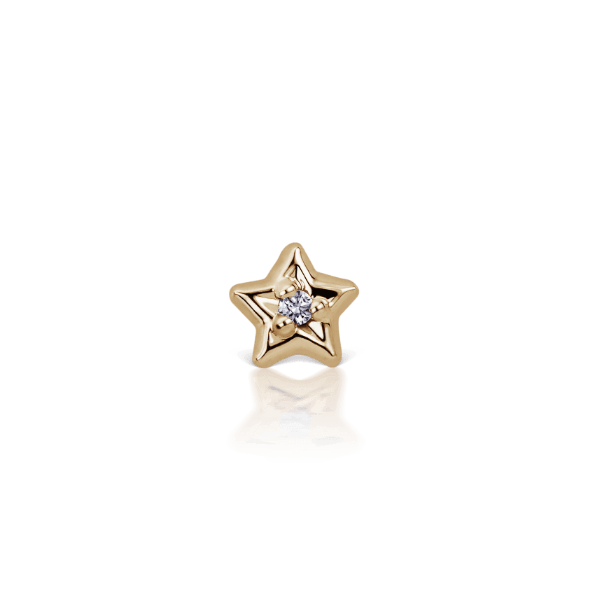 Den lilla stjärnan från Maria Tash har satt in en liten diamant i mitten. Baksidan är en blomma som lätt kan skruvas av och på med sin tråd.