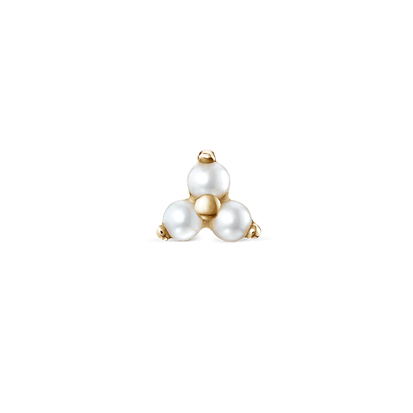 Den lilla Trinity Stud från Maria Tash har satt in tre små vita pärlor. Baksidan är en blomma som lätt kan skruvas av och på med sin tråd.