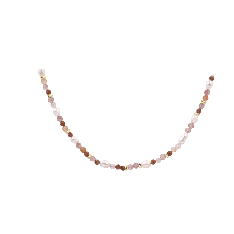 Aqua Dulce Peachy-halsbandet i guldpläterat silver är ett elegant och feminint halsband som kombinerar det bästa från naturens skattkammare. Den fina blandningen av grön jordgubbskvarts, sötvattenspärlor, gyllene sand och solsten skapar en unik och briljant look, perfekt för både vardag och speciella tillfällen.