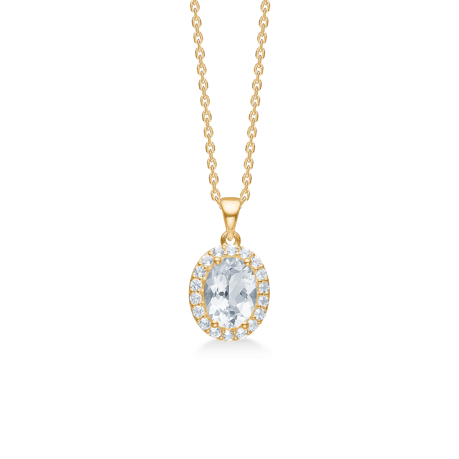 Hänget är tillverkat av 8 karat guld och prydt med iögonfallande facetterade vita topaser, omgiven av gnistrande vita zirkoner. Kombinationen av dessa element skapar en vacker kontrast och en design som är både slående och elegant. Celestial av Medina är ett tidlöst möte mellan elegans och Medinas personliga uttryck.