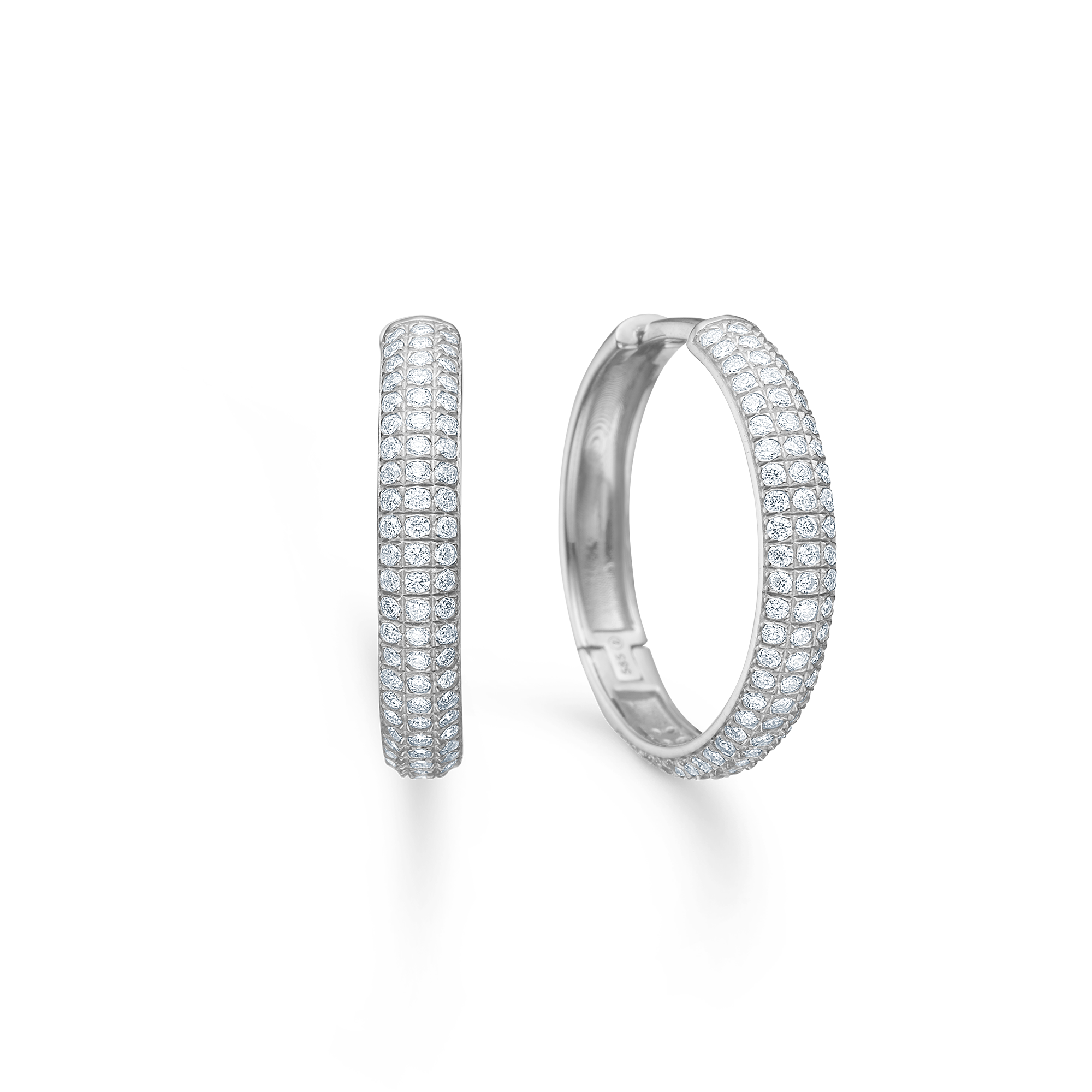 Lunette-örhängen i rodiumpläterat sterlingsilver med pavésatta vita topaser kombinerar nordisk elegans, modern design och kompromisslöst hantverk.