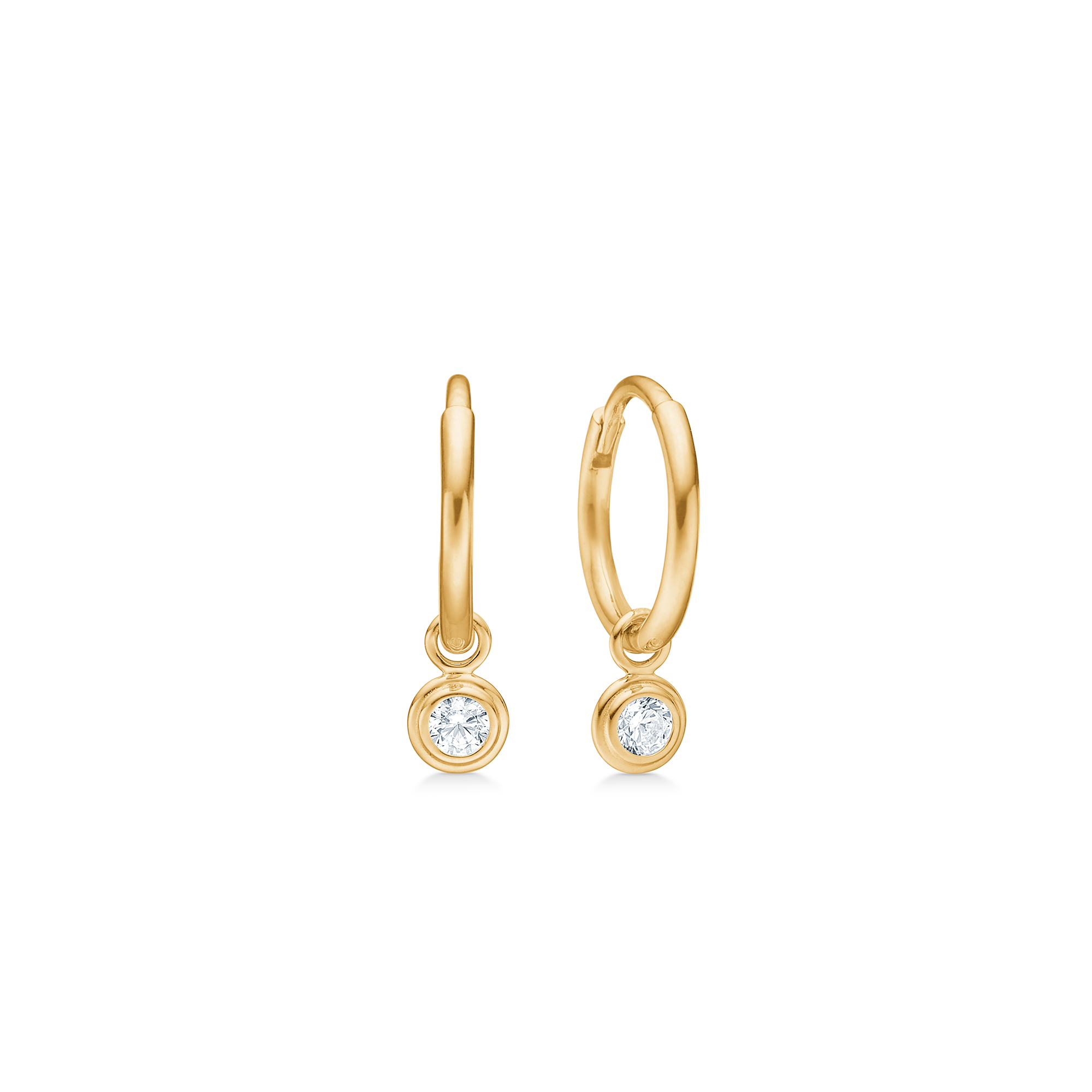Mads Z Raindrop bågeörhängen i 8 karat guld kombinerar klassiska bågar med ett elegant, rörligt hänge. Den lilla runda zirkonen är infattad i en slät guldram och hänger lätt under kreolen – som en gnistrande regndroppe.