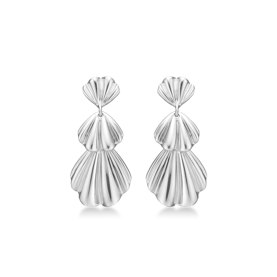 Örhängena är gjorda av handpolerat sterlingsilver, vilket framhäver ett lugnt, silkesmatt sken och djup i ytan. Den tredelade konstruktionen tillför subtil rörelse, så att smyckena verkar levande utan användning av stenar – här får formen stå i centrum.