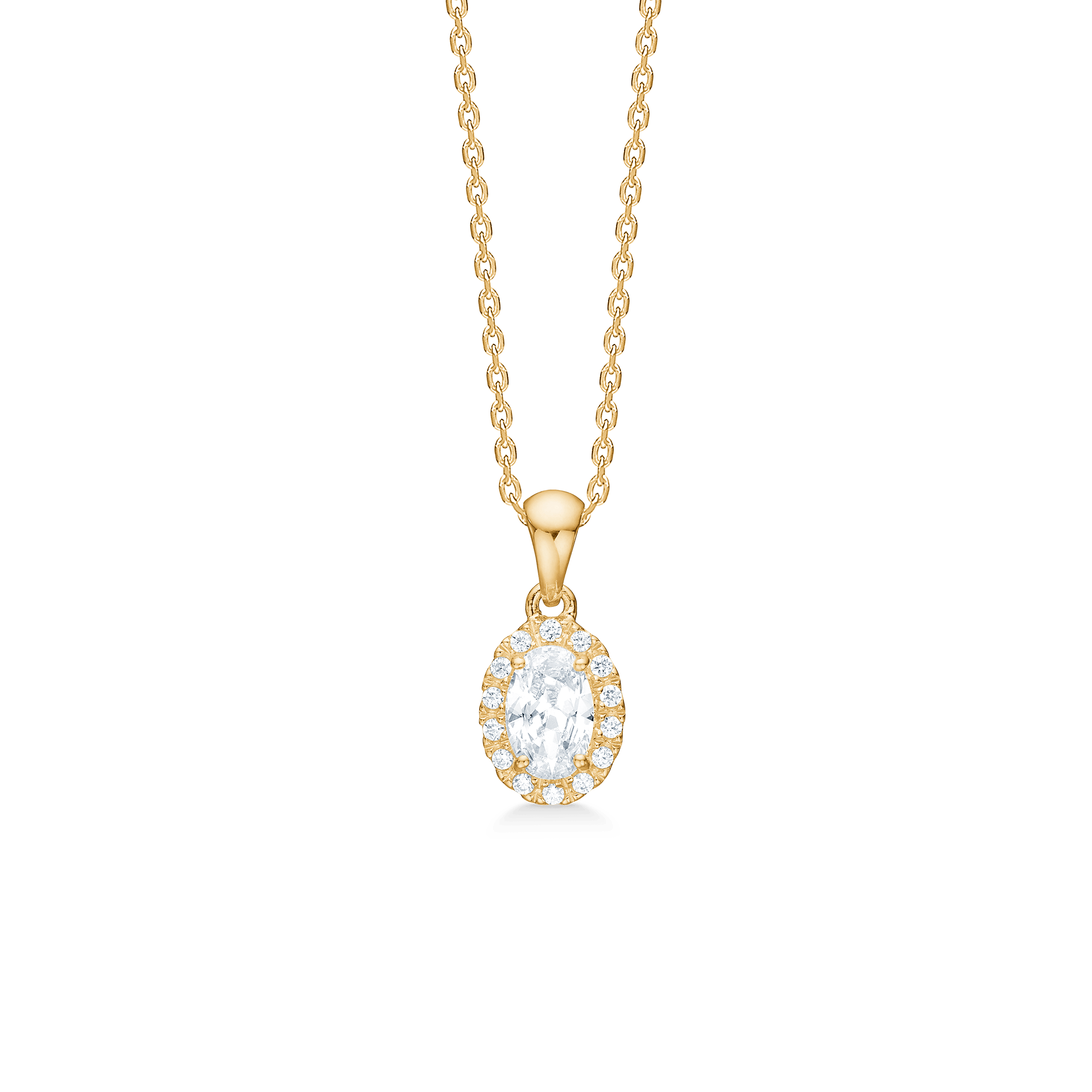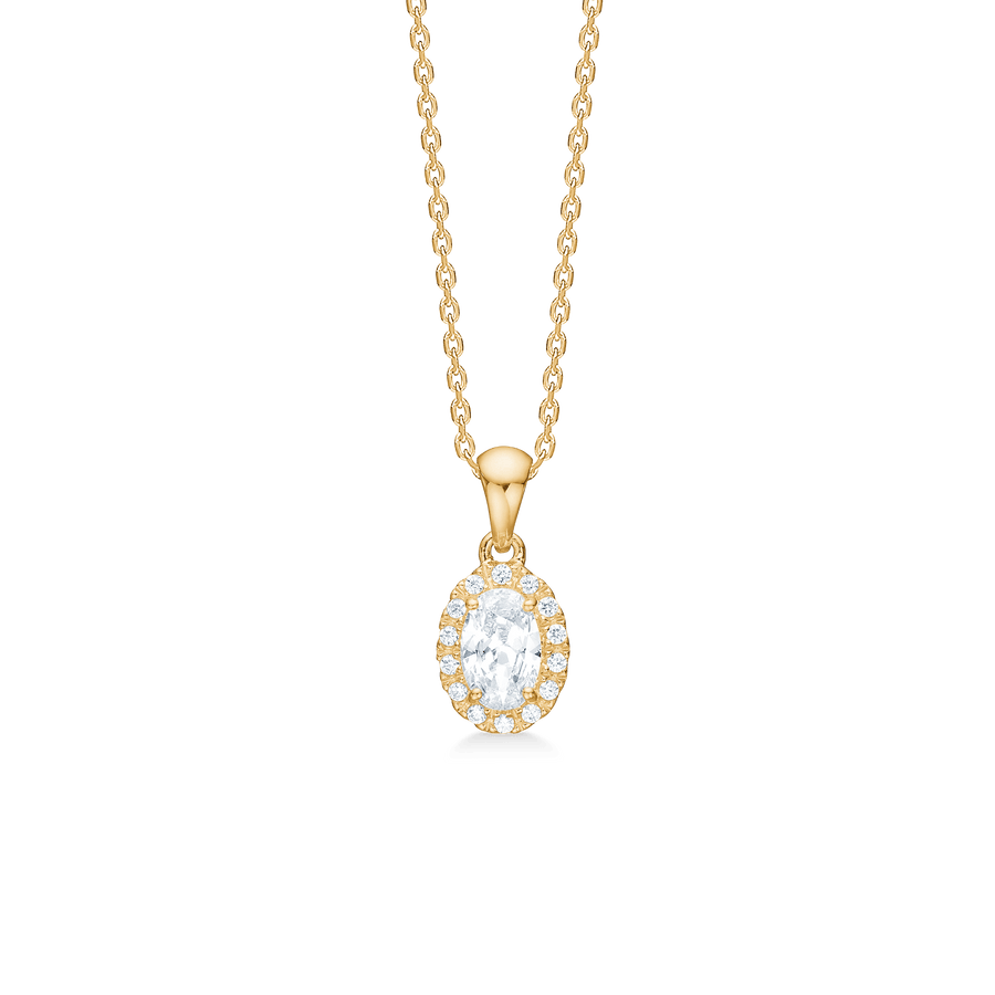 STELLAR-hänget från Mads Z White Label-kollektionen är gjord av 8 karat guld och prydd med gnistrande zirkoner. Detta vackra hänge är designat med en elegant oval form och en gloria av små cubic zirconia som omger en central sten, vilket ger den en klassisk och tidlös look. Hänget är ett perfekt val för att sätta en sofistikerad touch till din smyckessamling.