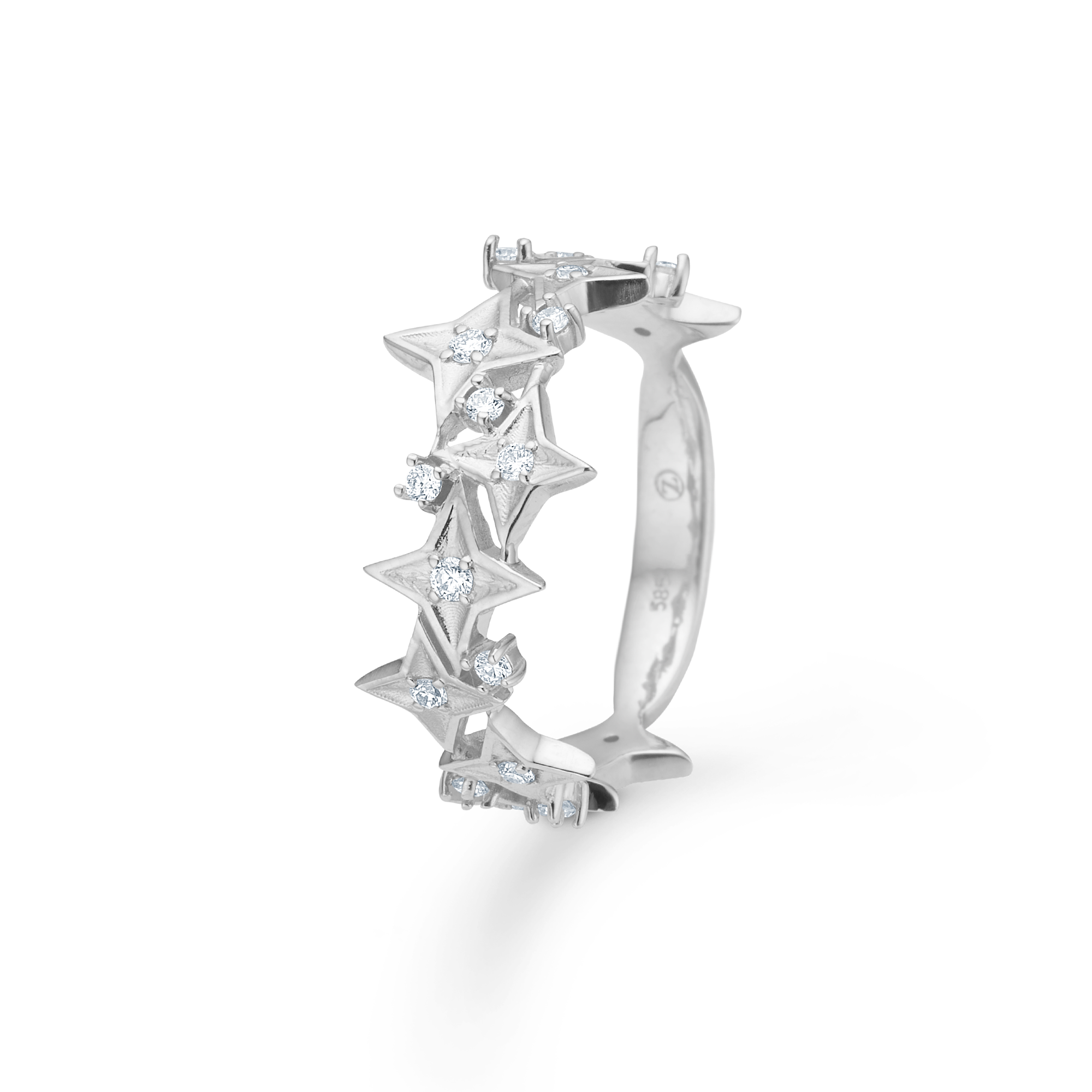 Moderna och eleganta ringar i sterlingsilver med facetterade vita topaser, där stjärnformade länkar och grafiska linjer möts i en lätt öppen struktur. En design som kombinerar ädla material med funktionell komfort.