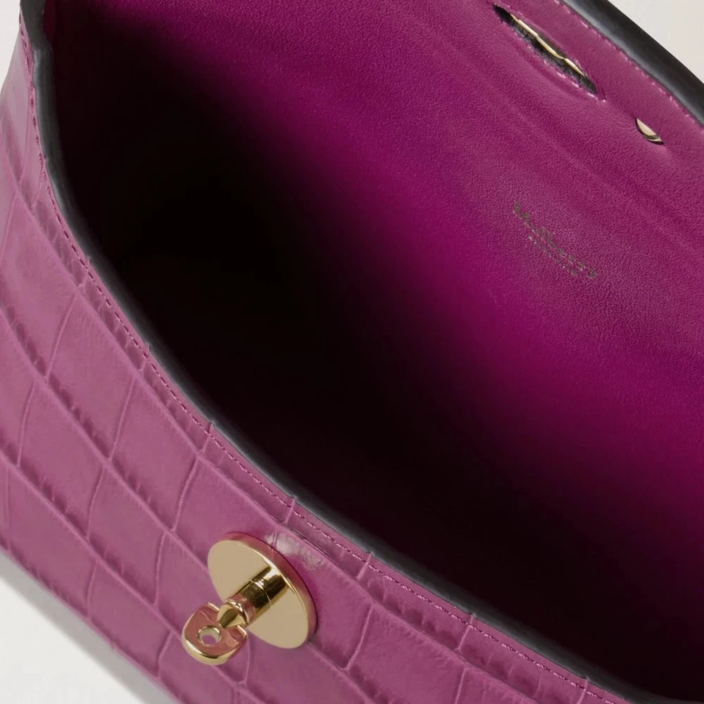 Förvara dina kosmetiska produkter med stil Darley Kosmetisk påse. Tillverkad av Mulberrys signaturläder i den vackra Orchid Bloom-färgen, denna eleganta väska är dekorerad med ett präglat krokodilmönster som ger den en lyxig och sofistikerad look. Den är färdig med det ikoniska Postman's Lock, som ger en diskret men elegant touch.