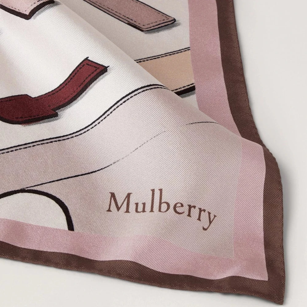 Den mångsidiga designen gör den perfekt att bära runt halsen för en sofistikerad look – eller som en vacker detalj på din favoritväska från Mulberry. Den mjukt rosa nyansen och det fina trycket är inspirerade av Mulberrys ikoniska Bayswater Workshop, och ger en elegant touch av färg till vilken outfit som helst.