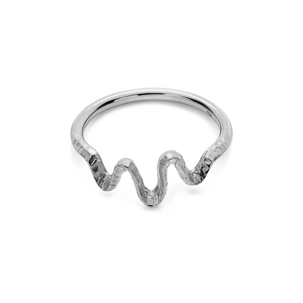 Sonarringen från Maanesten är en unik och elegant ring med en vågig design och en hamrad yta. Den är gjord av sterling silver som ger en vacker glans till ringen. Med sin dubbelvågsdesign pryder den fingret på ett dynamiskt och stilrent sätt.