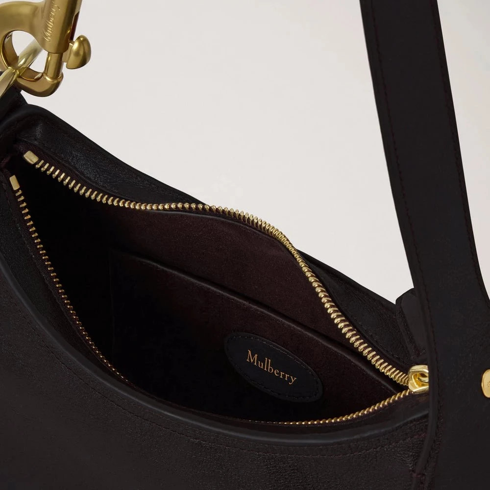 Väskan är gjord av vackert Shiny Buffalo-läder i färgen Ebony, ett vegetabiliskt garvat buffelläder med naturlig ådstruktur och glansig finish som bara blir vackrare med tiden. Varje påse passerar genom händerna på över 30 skickliga hantverkare, vilket återspeglar Mulberrys engagemang för kvalitet. De mässingsfärgade detaljerna, karbinhakens stängning och Mulberry Trädnitarna ger väskan ett sofistikerat men modernt utseende.