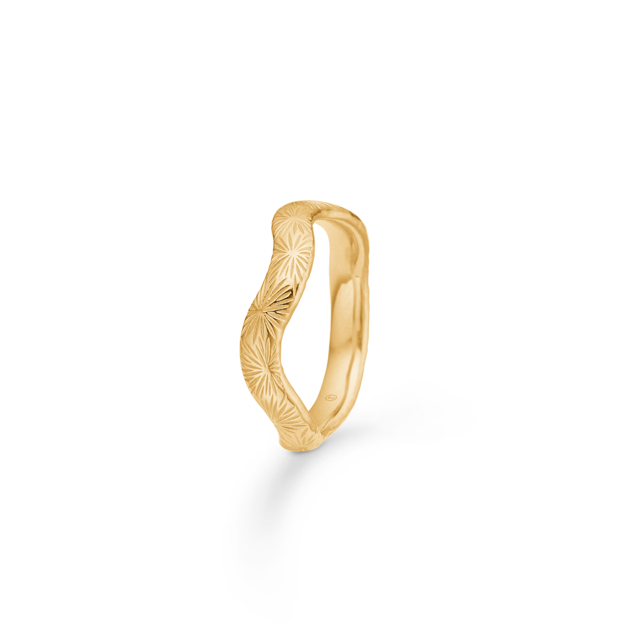Rime ringen fra Studio Z er inspireret af iskrystaller på en kold vintermorgen. Designet har en blød bølgeform med en stjernelignende tekstur, der skaber et diskret, glimtende spil og reflekterer lyset på en elegant måde. Et feminint og moderne smykke med fine detaljer.